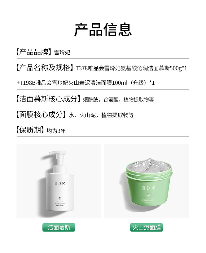 氨基酸沁润洁面慕斯500g+雪玲妃火山岩泥清洁面膜100ml